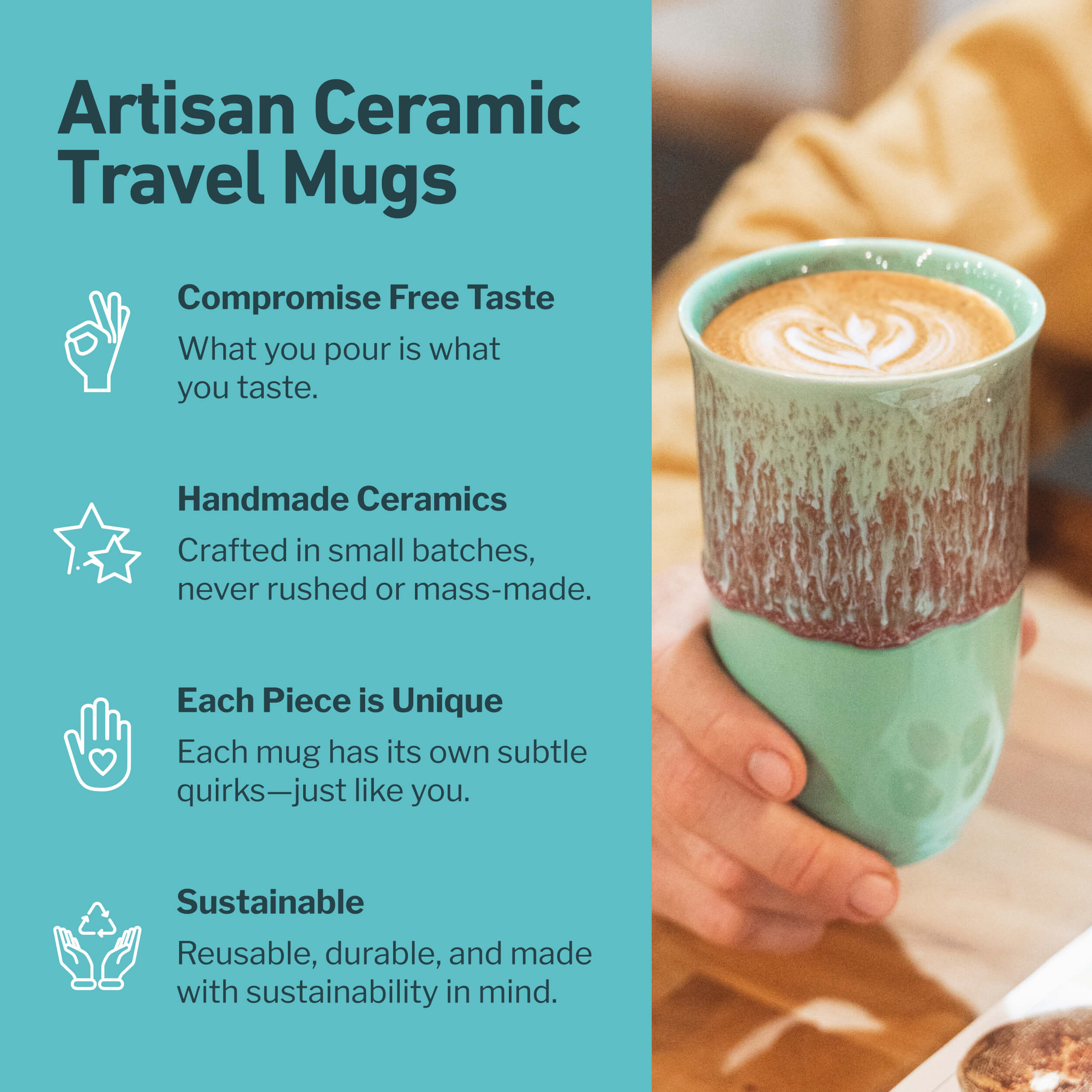 Tudatosan keresed a szépséget. Törődsz a bolygóval – így logikus, hogy fenntarthatóbb kézműves bögrére válts. A Nova Ceramics egyedi, kiváló minőségű utazópoharakat kínál, amelyek segítenek csökkenteni az egyszer használatos műanyaghulladékot. Adj tudatos átalakítást a kávé- (vagy tea-) rutinodnak.