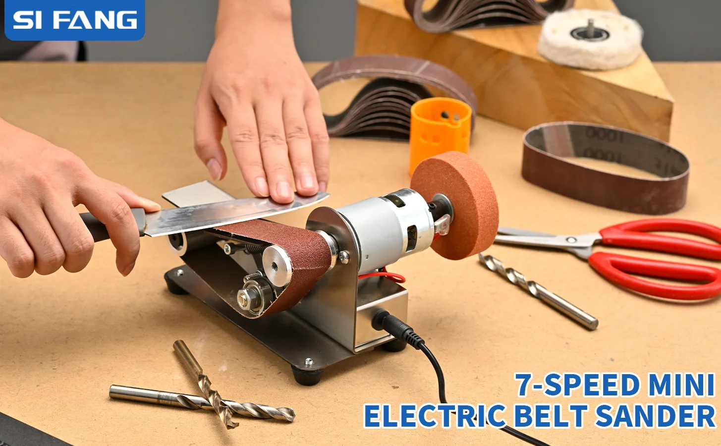 Ietver dažādus komplektus, varat izvēlēties slīplenti vai slīpēšanas disku. Uzstādot slīpēšanas disku vai kokvilnas auduma disku, mini lentes slīpmašīnu var pārveidot par mini galda slīpmašīnu. Tai ir pilns funkciju komplekts, ko var izmantot caurumu urbšanai, slīpēšanai ar slīpēšanas disku, pulēšanas auduma disku, pulēšanas disku utt.