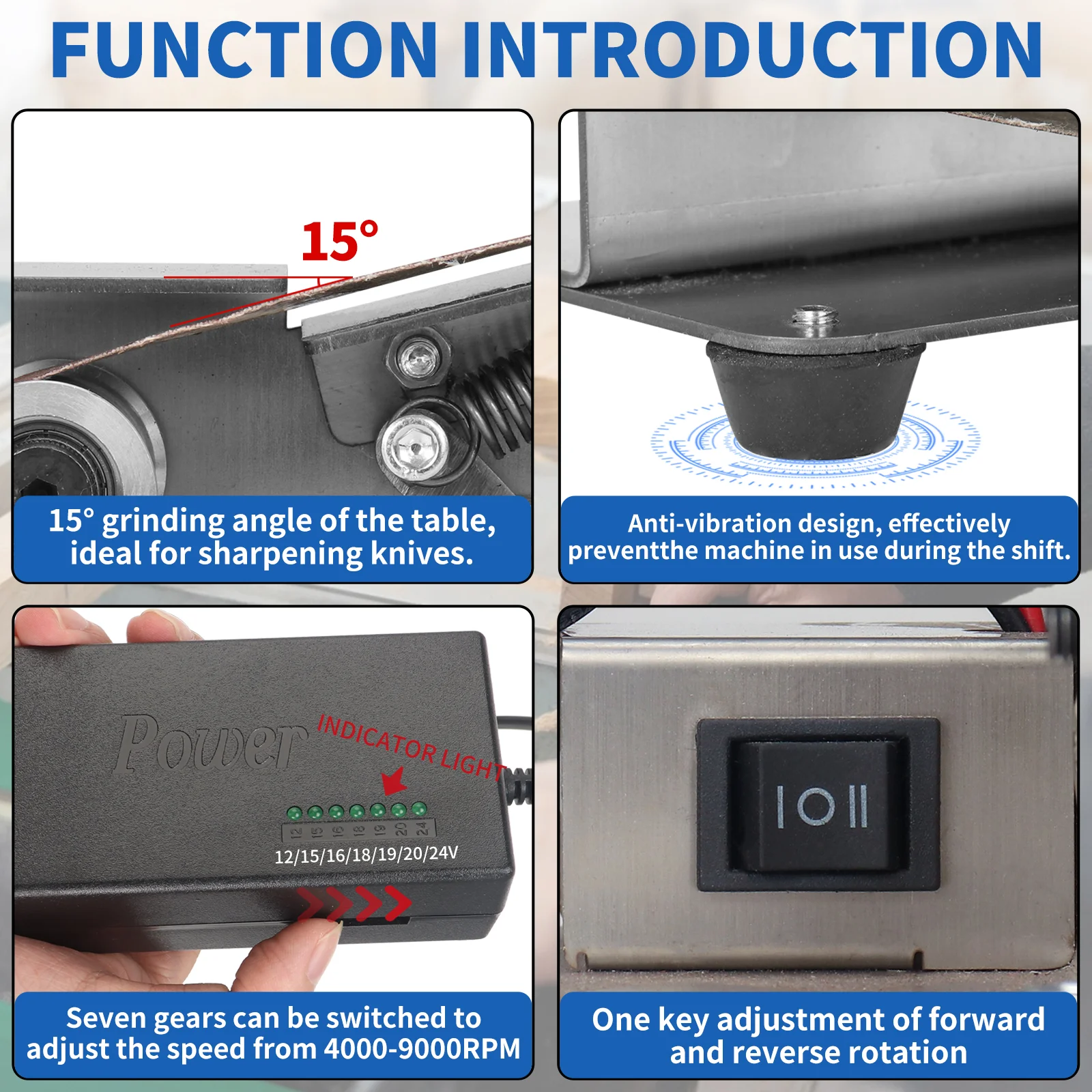 Lentes slīpmašīnas darba virsmas leņķi var regulēt pēc vēlēšanās, kas nodrošina ērtu lietošanu. Lentes nažu asinātājam ir īpaši jaudīgs motors ar tukšgaitas ātrumu 4500–9000 apgr./min, tāpēc tas var labi slīpēt metālu, nažus, koku, akrilu un citus materiālus. Slīpē augstas cietības materiālus, efektīvi un stabili, izturīgi un praktiski.