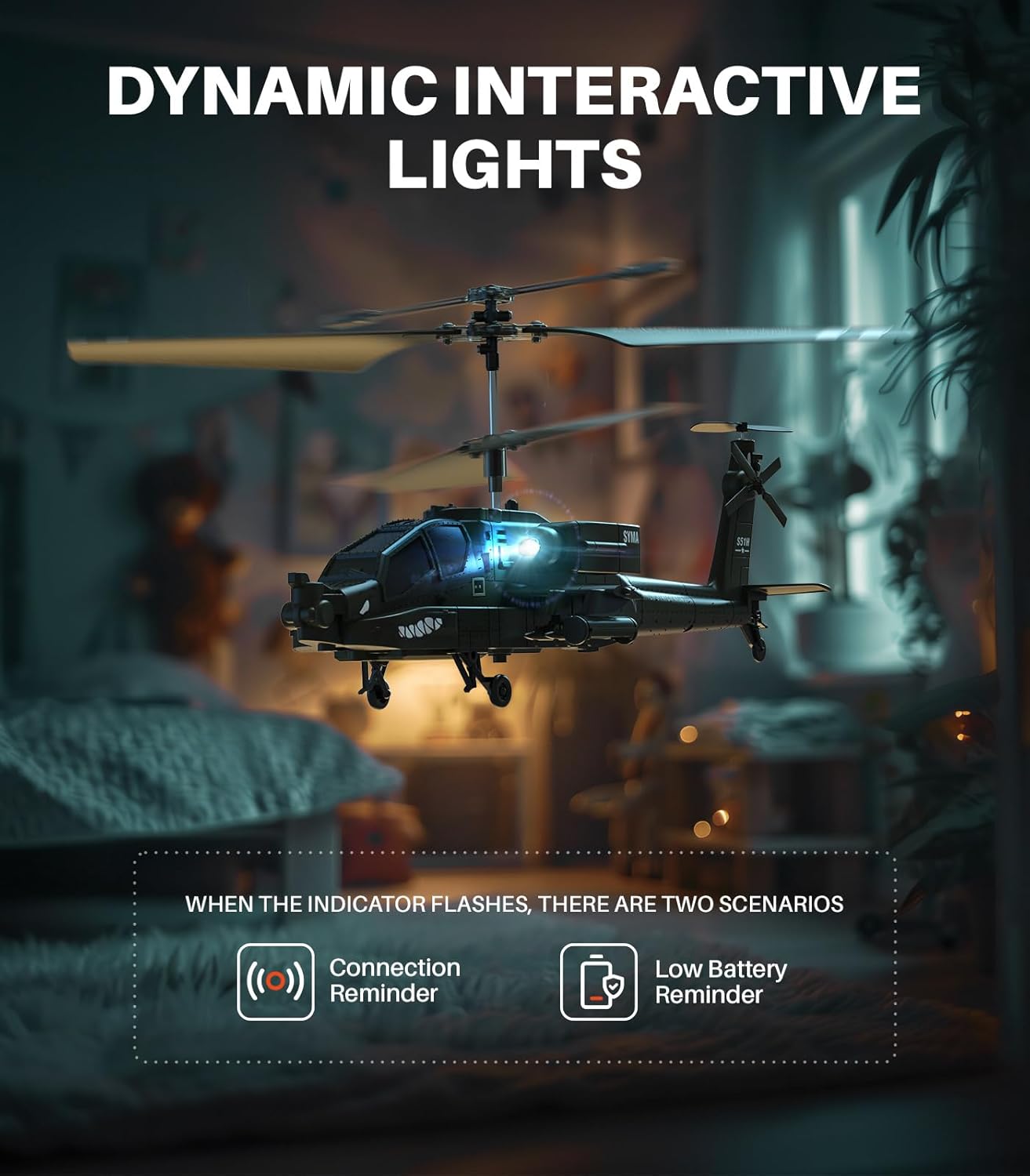 Systém dvojité ochrany: Pokud se listy vrtulníku zaseknou nebo zablokují během letu, aktivuje se vestavěné zastavení motoru, aby se zabránilo poškození. Když je baterie téměř vybitá, světla vrtulníku zablikají jako vizuální připomínka nutnosti přistání.
