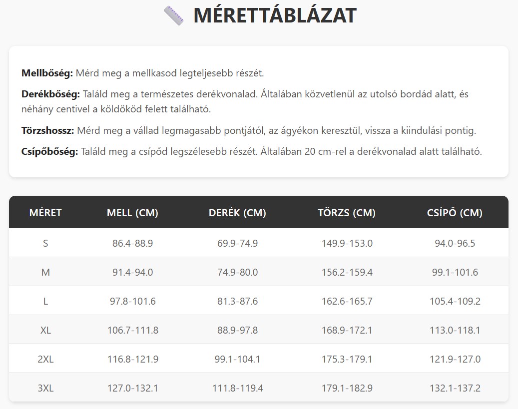 Mérettáblázat