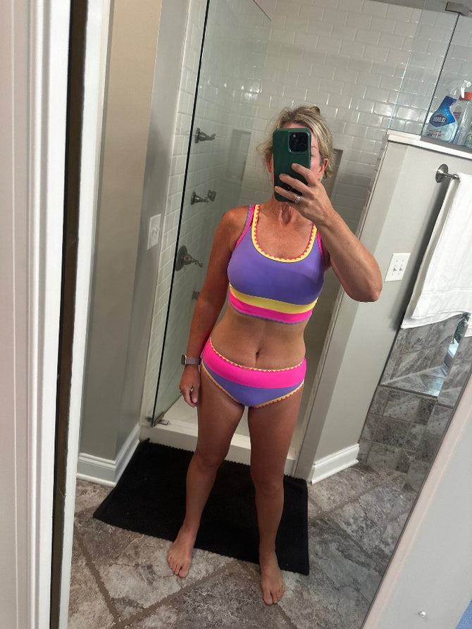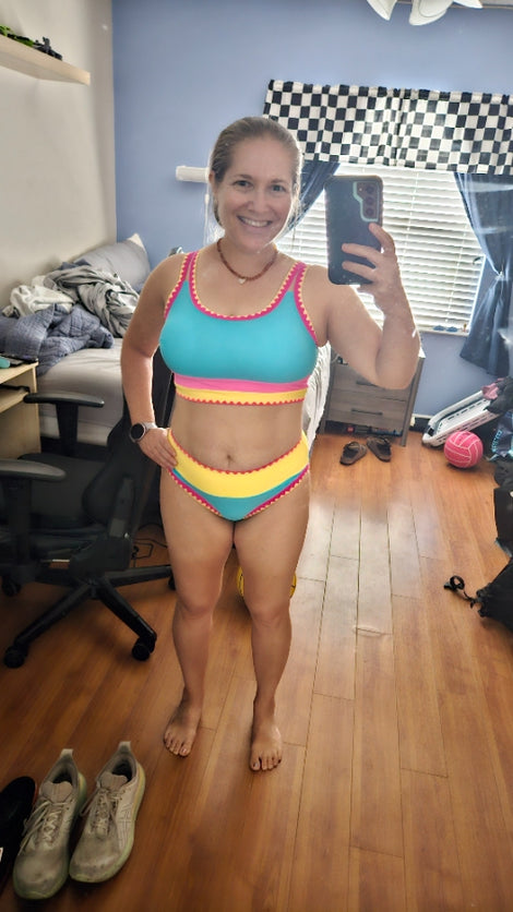 Egy hozzá illő bikinifelsőt és két összeillő alsót tartalmaz, amelyeket együtt viselhetnek, így egy teljes és egységes, sportos, könnyed stílust biztosító összeállítást alkotva.