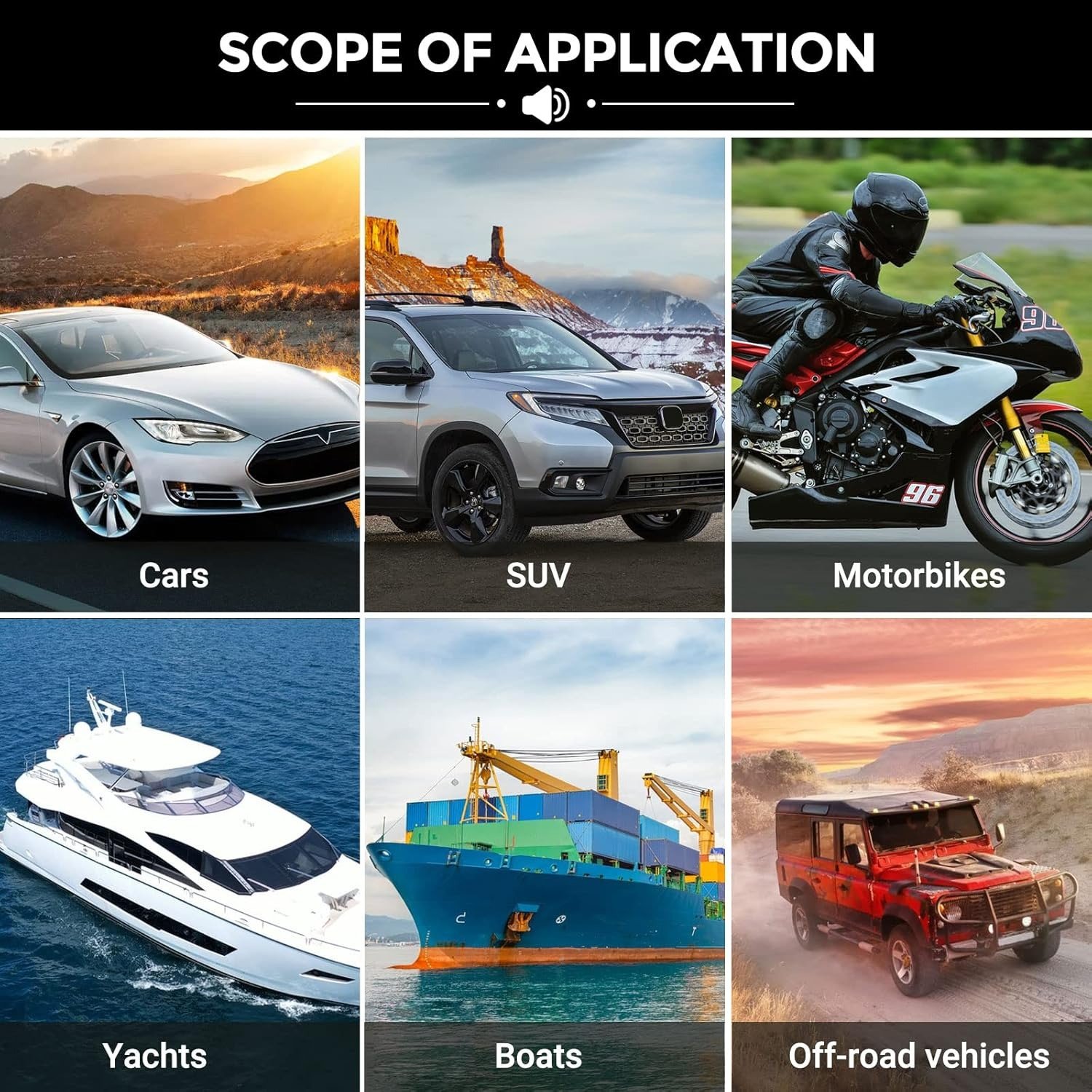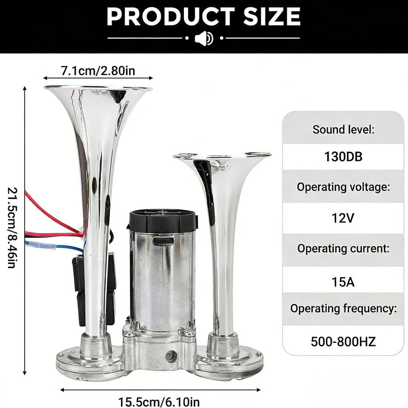Fülsiketítő, 130–135 dB-es hangerővel ez a kettős kürt tökéletes autókhoz, teherautókhoz, pickupokhoz, vonatokhoz, terepjárókhoz, hajókhoz és akár otthoni riasztórendszerekhez is.